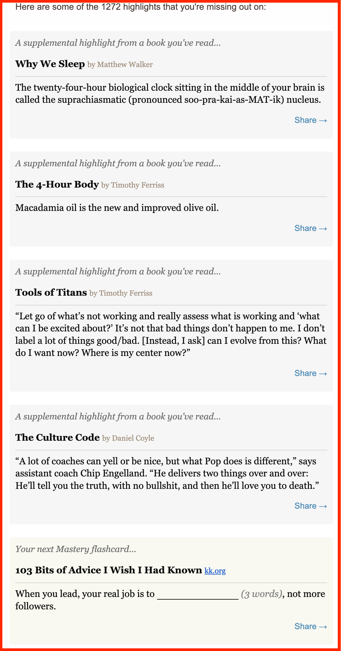 Use an app like Readwise to read your or popular highlights of books you have read in the past. The app will send an email at your scheduled time with highlights of your books on kindle (you can upload a picture of your actual book highlights as well) and popular highlights from other readers. I love this app because reviewing the book's highlights is a great way to remember the key learnings from all the books I have read.Â